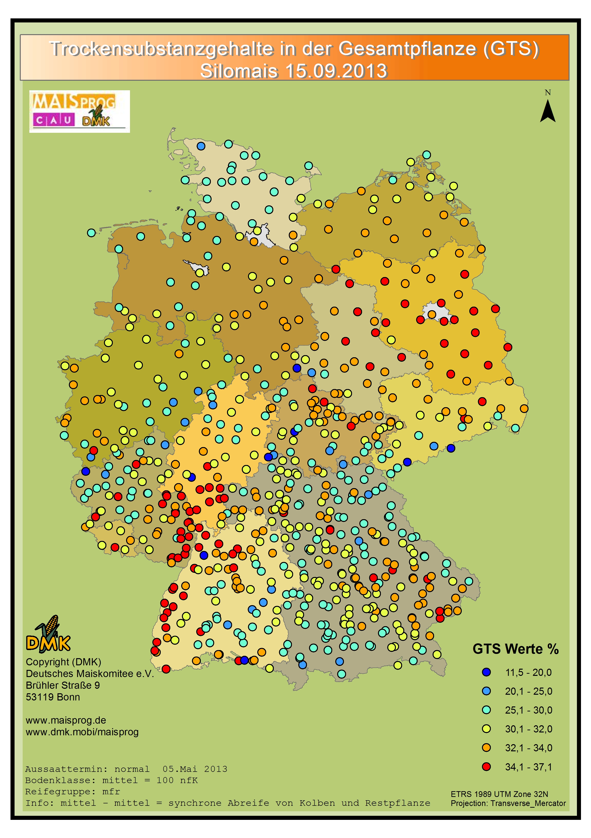Das Deutsche Maiskomitee e.V. (DMK) hat mit dem Erntezeitprognosemodel „MaisProg“ die Trockensubstanzgehalte in der Gesamtpflanze (GTS %) auf Basis einer mittelfrühen Sorte (S 250) deutschlandweit geschätzt (Grafik). Die Silomaisreife ist für die mittelfrühen Silomaisbestände in den Gunstlagen Süddeutschlands, dem Rheingraben in Baden-Württemberg und dem Rottal in Niederbayern schon erreicht und zeigt, dass auch die Ernte der mittelspäten Silomaissorten in diesen Regionen ansteht. Dies bestätigen auch Berichte aus der Praxis, die die geplante Ernte aufgrund der ausgiebigen Niederschläge in den letzten 10 Tagen jedoch verschieben mussten.