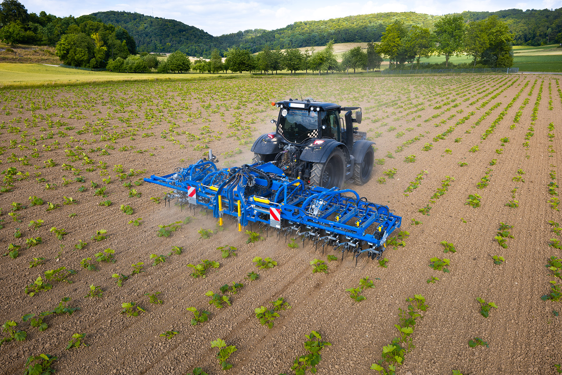 Transformer VF - präzise und robuste Hacktechnik in 6, 9, 12 und 18 m Arbeitsbreite. Durch die kruze Bauweise mit dem vollintegrierten Seitenverschieberahmen wird die Maschine kompakt und präzise zugleich. Die kameragesteuerte Seitenverschiebeeinheit mit 450 mm Verschiebeweg bietet umfassende Möglichkeiten für die Nutzung in verschiedenen Kulturen und Bedingungen. Zwei verschiedene Parallelogram-Bauweisen sorgen für eine Nutzung in den gängigen Reihenabständen von 15 bis 80 cm. Die Arbeitstiefe lässt sich simpel und ohne Werkzeug stufenweise einstellen. Zusatzwerkzeuge wie Kulturschutzscheiben/-bleche, Fingerhacken, Häufelbleche und weitere Optionen sind natürlich auch erhältlich. Mit RowLift (Section Control) werden Überlappungen und Bearbeitungslücken am Vorgewende auf ein Minimum reduziert. Doppelwirkende Hubzylinder für die Parallelogramme sind ebenso erhältlich, was einen höheren Schardruck und die Einstellung dessen, während der Fahrt ermöglicht. Weitere Zusatzoptionen wie Hartmetallbeschichtungen der Schare oder das Ausbringen von Dünger und Untersaaten sind ebenso möglich.
