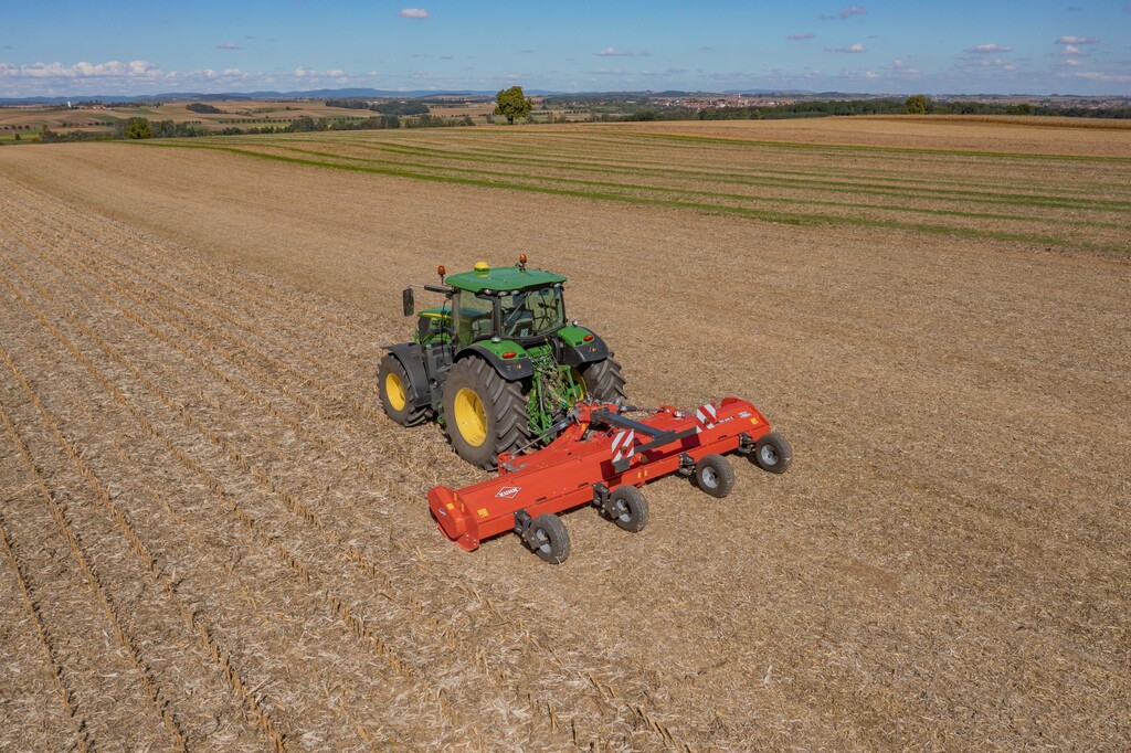 Der KUHN RM 610R ist ein Mulchgerät am Heck des Traktors. Die Maschine ist speziell für den Ackerbau entwickelt worden. Die 68 Hammerschlägel und ihre schraubenförmige Anordnung sorgen für eine hohe Sogwirkung und eine großartige Zerkleinerung des Strohs.